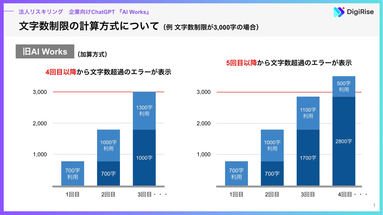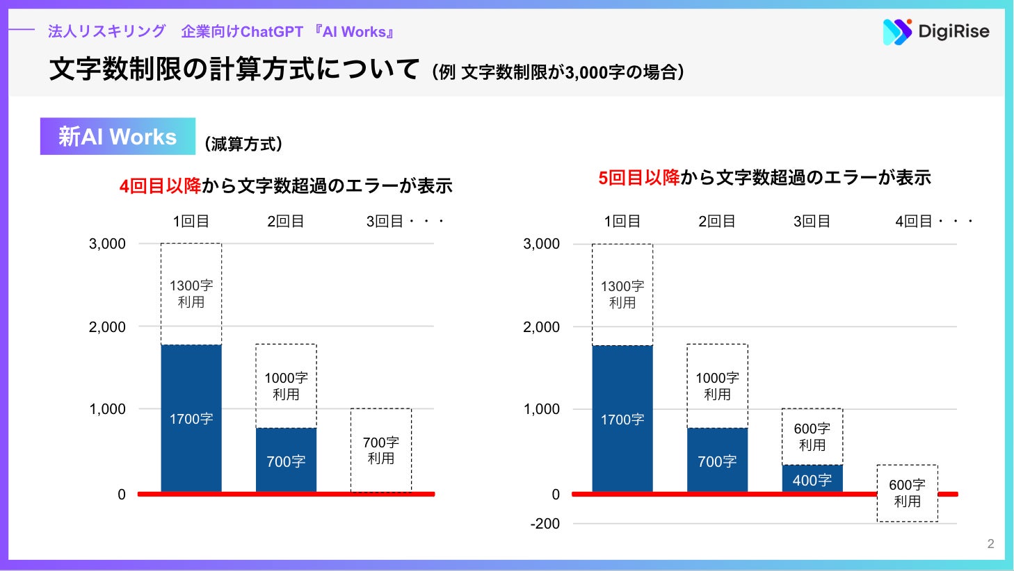 企業の多様な利用ニーズに対応するため、AI Worksの文字数制限の運用方法を改善し、新しい課金システムを導入しました。