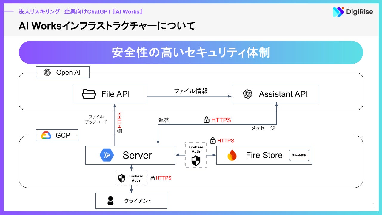 デジライズは、より高度な企業向けAIプラットフォームの実現を目指し、AI WorksのサービスインフラストラクチャーをGoogle Cloud Platform(GCP)へ移行しました。GCPの採用により、OpenAI APIとの連携、File APIとAssistant APIの統合、Firebase Authによる認証システム、Fire Storeによるチャット情報の管理など、包括的なシステム基盤を構築しています。