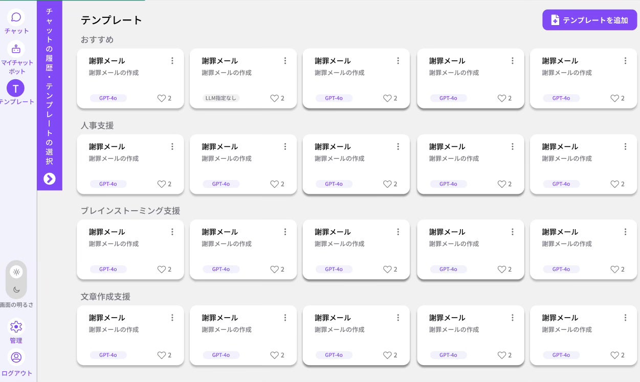 企業内でのAI活用をより効率的に推進するため、組織内でテンプレートを作成・共有できる機能を導入しました。従来の個人単位でのテンプレート作成に加え、組織全体でナレッジを共有できる環境を整備することで、チーム全体の業務効率化を実現します。
