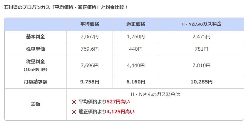 そこで、H・Nさんのプロパンガス料金は実際に高いのか、石川県のプロパンガスの平均価格・適正価格*とそれぞれの料金を比較してみました。