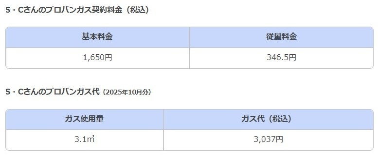 実際に、H・Nさんのプロパンガスの「基本料金」が2,475円であるのに対し、S・Cさんは1,650円。「従量料金」単価は、H・Nさんの781円に対して、S・Cさんは346.5円と、H・Nさんの約2倍近くも安くなっています。
