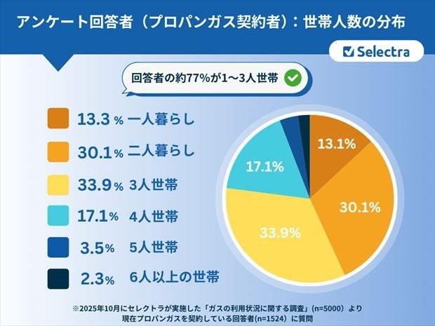ひと月あたり2,500円以上のガス代を削減できた契約者がいなかったのは、アンケート回答者の77.3%が、ガス使用量・ガス代がそこまで多くない1人~3人世帯に集中していたことも影響していると考えられます。