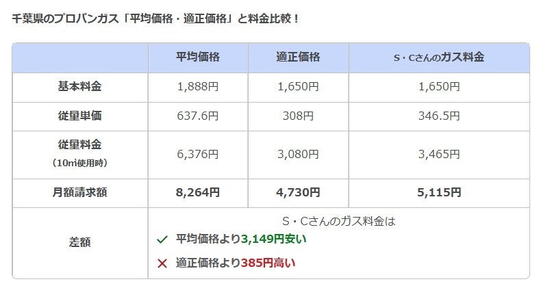 そこで、同様に、S・Cさんのプロパンガス料金についても、千葉県のプロパンガスの平均価格・適正価格*とそれぞれの料金を比較してみました。