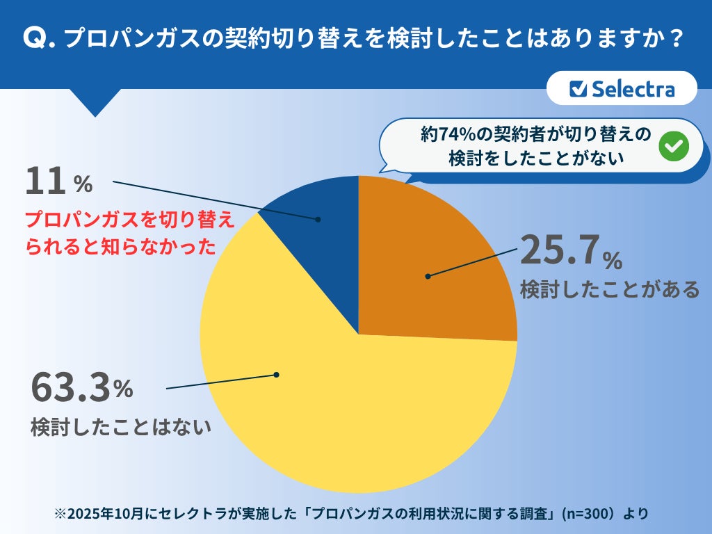 プロパンガスの契約者では、「契約切り替えを検討したことがない」「切り替え可能と知らなかった」と回答した方が計74.3%もいました。