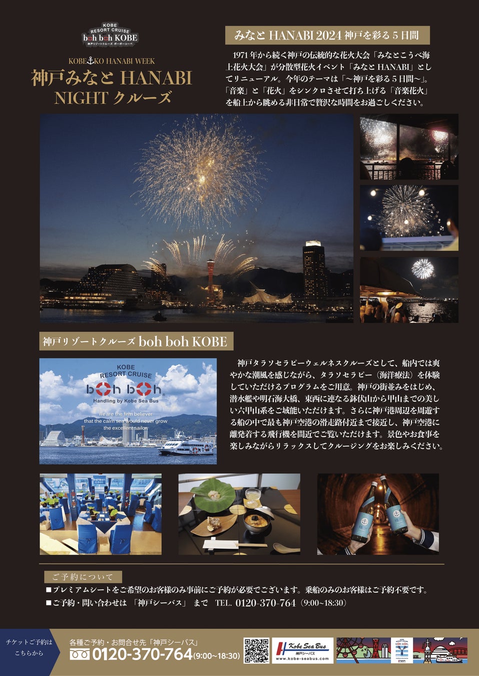 神戸シーバスboh boh KOBEは、10月21日(月)~25日(金)まで(※24日を除く)「神戸みなとHANABI NIGHTクルーズ」を開催いたします。本イベントは、「みなとHANABI 2024」で打ちあがる美しい花火に合わせた特別クルーズで、花火とミシュランガイド一つ星を獲得している京都の料亭「杦-SEN-」の杉澤料理長監修の日本の食文化と拘りぬいた神戸の食材が織りなす、boh boh KOBEでしか味わえない「神戸食」を楽しむ華やかなイベントです。