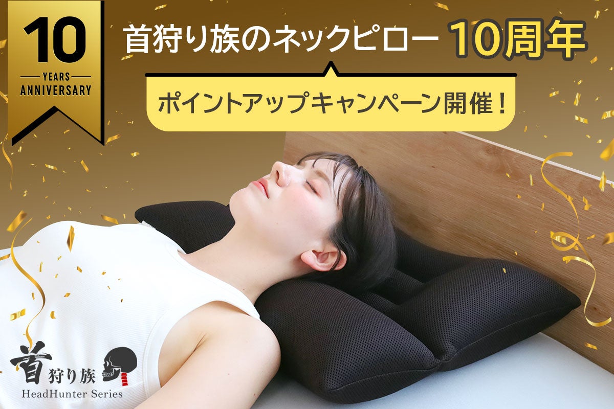 「首を支える枕」がコンセプトの「首狩り族シリーズ」は発売から10周年を迎えました!これを記念し楽天にて『首狩り族のネックピロー』ポイントアップキャンペーンを開催!