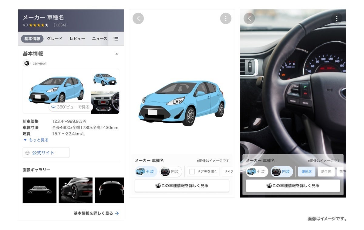 ※2:本機能は、Yahoo! JAPANが運営する日本最大級の自動車総合情報サイト「carview!(カービュー)」( https://carview.yahoo.co.jp/ )で提供する「360°ビュー機能」を活用したものです。