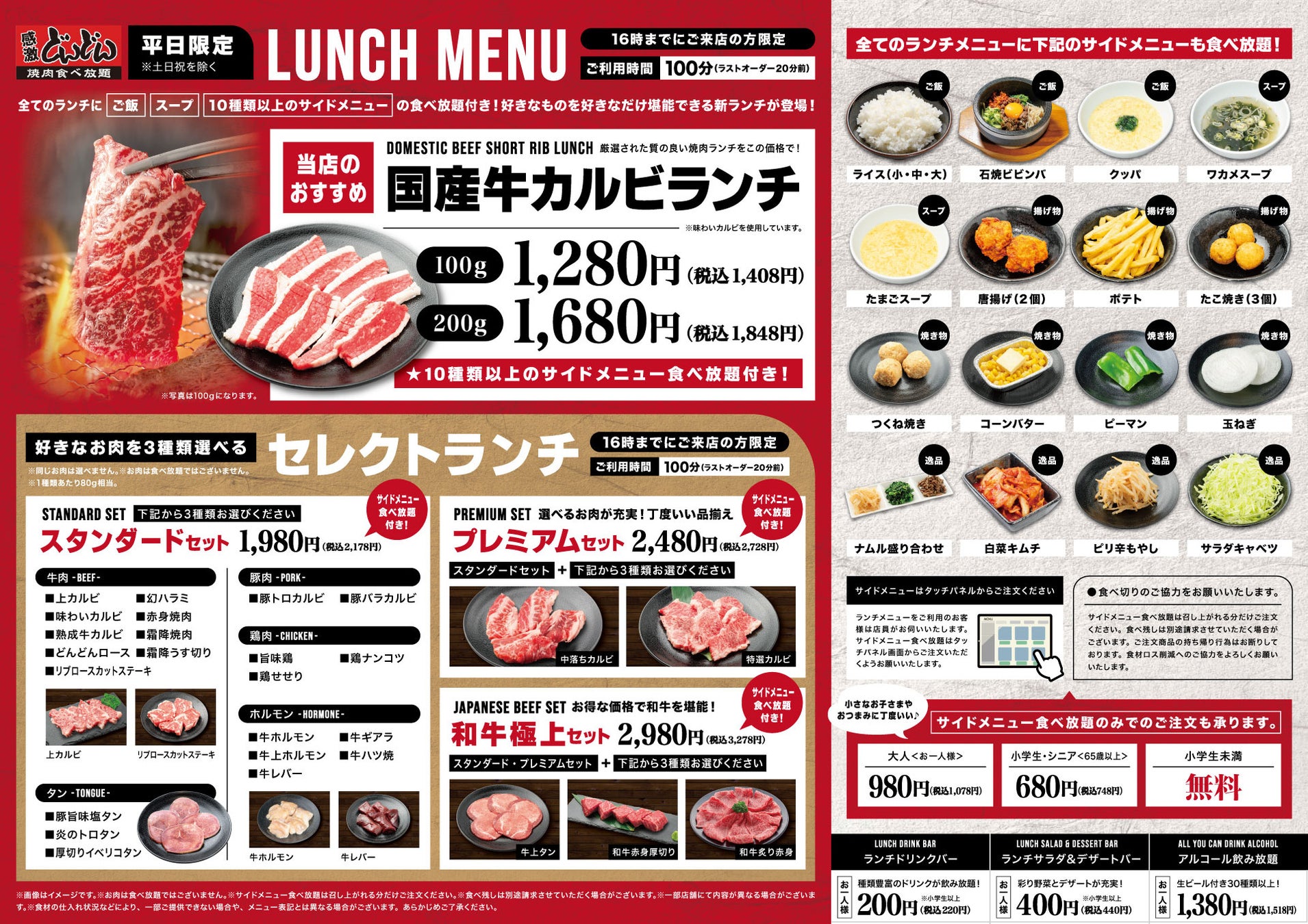 また、お好きなお肉を3種類選べるセレクトランチや、全てのランチメニューにご飯・スープ・逸品など10種類以上のサイドメニュー食べ放題が付いております。