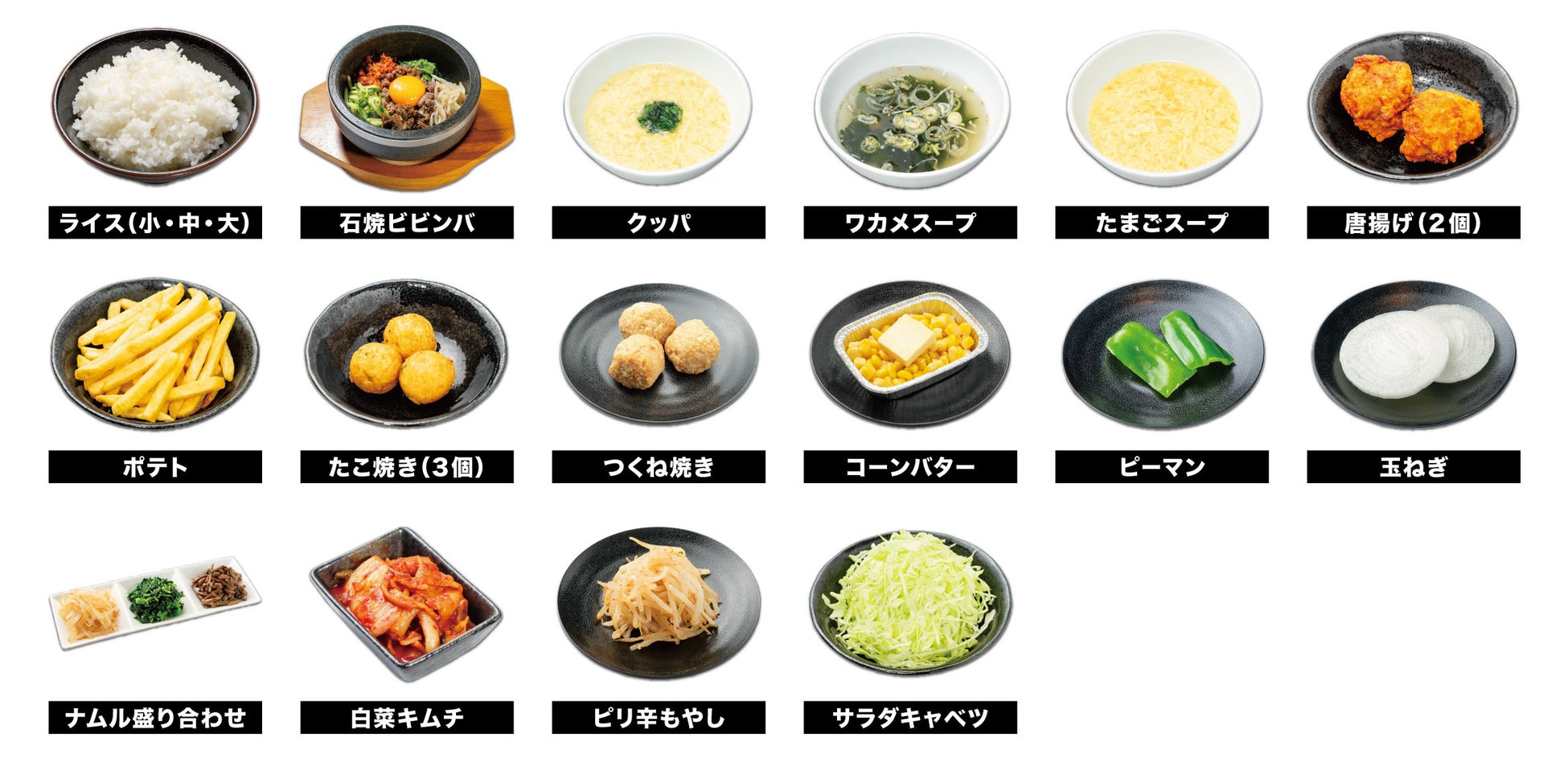 ライス(小・中・大) / 石焼ビビンバ / クッパ / ワカメスープ / たまごスープ / 唐揚げ / ポテト / たこ焼き / つくね焼き / コーンバター /ピーマン / 玉ねぎ / ナムル盛り合わせ / 白菜キムチ / ピリ辛もやし / サラダキャベツ