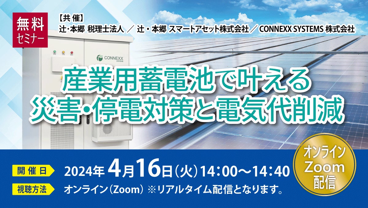 辻・本郷 税理士法人(本社:東京都新宿区、理事長:徳田孝司)は、辻・本郷 スマートアセット株式会社(本社:東京都新宿区、代表取締役社長:𠮷川僚)とCONNEXX SYSTEMS株式会社(本社:京都府相楽郡、代表取締役:塚本壽)の3社共催で「産業用蓄電池で叶える災害・停電対策と電気代削減」セミナーをオンライン(Zoom)にて配信いたします。本セミナーでは、自家消費型太陽光発電・蓄電池を取り巻く市場の最新情報と導入事例をご紹介しながら、運用イメージをわかりやすくお伝えします。最後には、産業用蓄電池の課題と、そのソリューションとして産業用蓄電池LUVISをご紹介します。