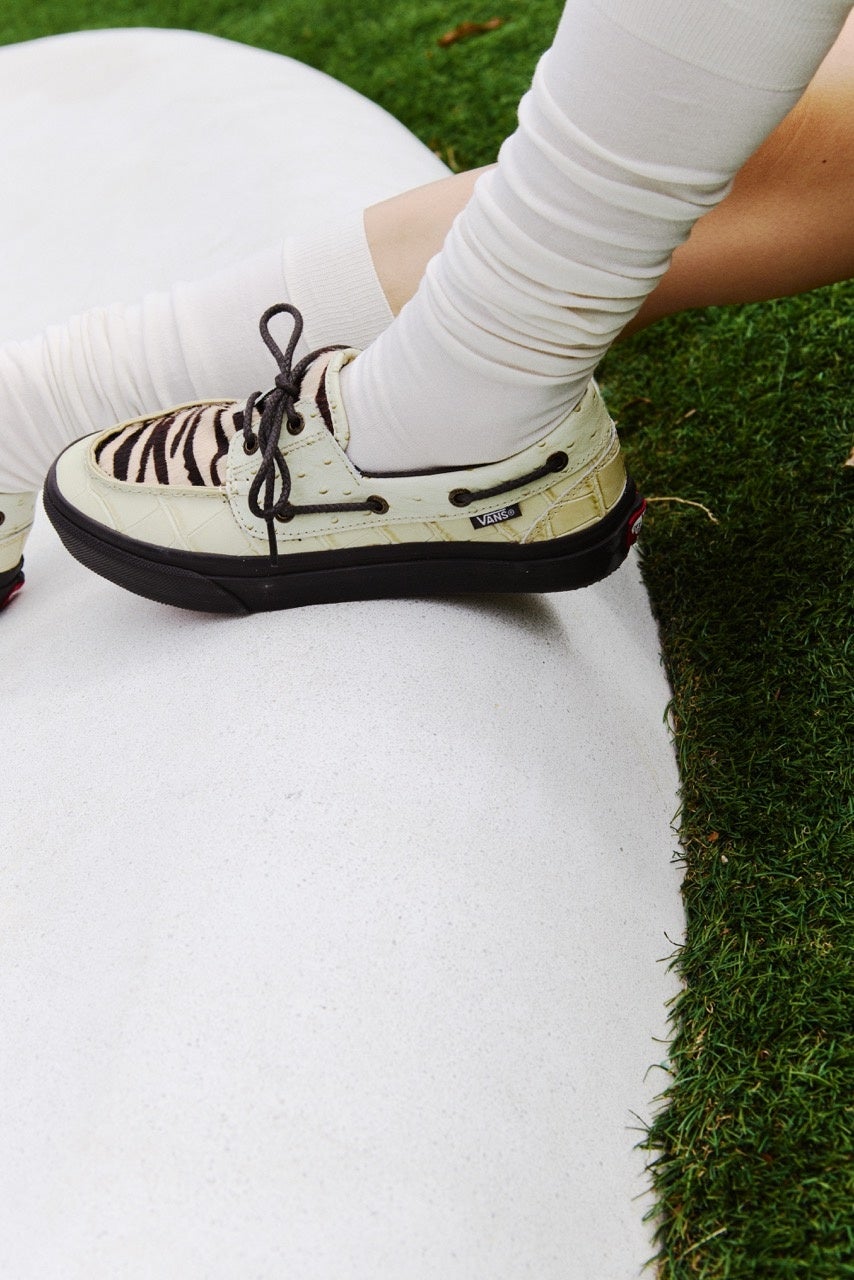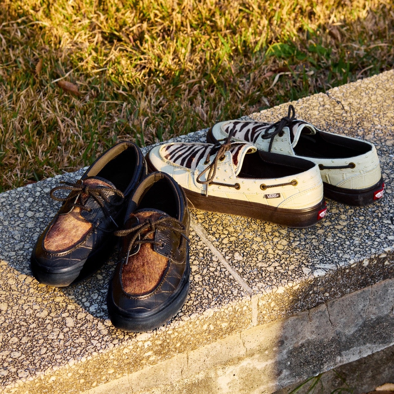 「個性を引き出す、ヒップなVANS」というコンセプトのもと、定番のバルカナイズドソールに2アイレットモカシンシルエットを組み合わせた「VANS 2 EYELET」をベースに、バンプにアニマル柄素材を使用した存在感のある一足。