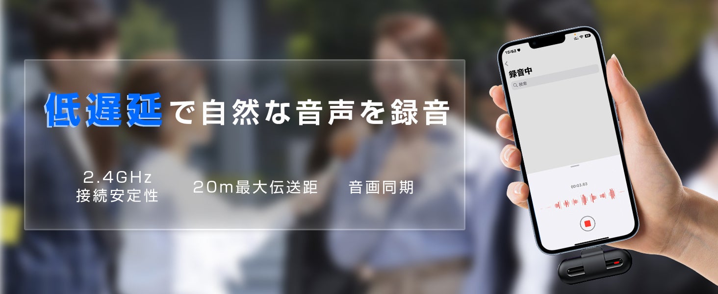さらに、このワイヤレスピンマイクは瞬時接続と音画同期の機能も備えています。専用アプリのインストールやBluetooth接続は不要で、スマホに挿入すると瞬時に接続され、ピンマイクの利用が始められます。自動同期技術により、20メートル離れていても信号の途切れや画面の遅延を心配することなく、スマホにクリアな音声を送信できます。
