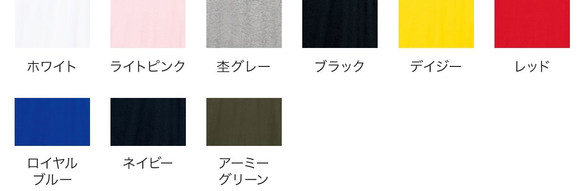 110のジュニアサイズ~3XLのアダルトサイズまで、全9サイズで「ロングスリーブTシャツ」がご作成いただけるようになりました。また、生地カラーはホワイトやブラックといった定番の色に、新色のアーミーグリーンを加えた9色からご選択可能です。豊富なサイズとカラーバリエーションで、年齢や性別を問わずお揃いのデザインで長袖Tシャツをご作成いただけます。