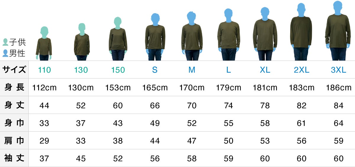 サイズ:ジュニアサイズ(110、130、150)とアダルトサイズ(S、M、L、XL、2XL、3XL)の全9サイズ