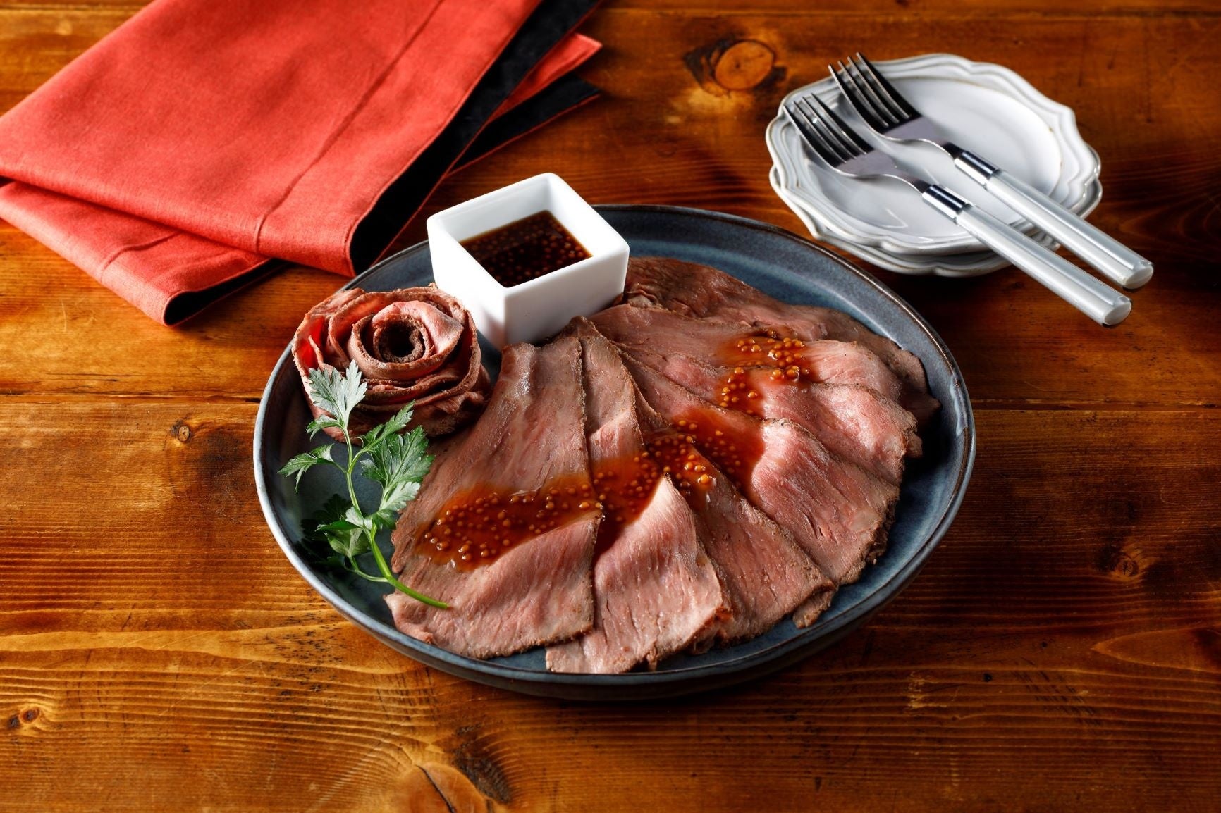 低温でじっくり火入れしたローストビーフ。肉本来の旨味を引き立てる粒マスタードにはちみつを加えた特製ゴールデンソースが、華やかな聖夜のメインを彩ります。