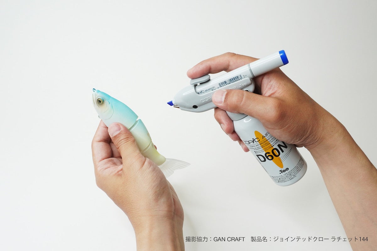 コピックのマーカーは、イラストや漫画、デザイン画などへの着色に使われるほか、実はルアー塗装にも使うことが可能です。コピックスケッチをそのまま着彩に使うのはもちろん、コピックスケッチを装着して色を噴射する「コピックエアーブラッシングシステム」を使用することでエアブラシ効果が得られ、自然なグラデーションが可能になります。