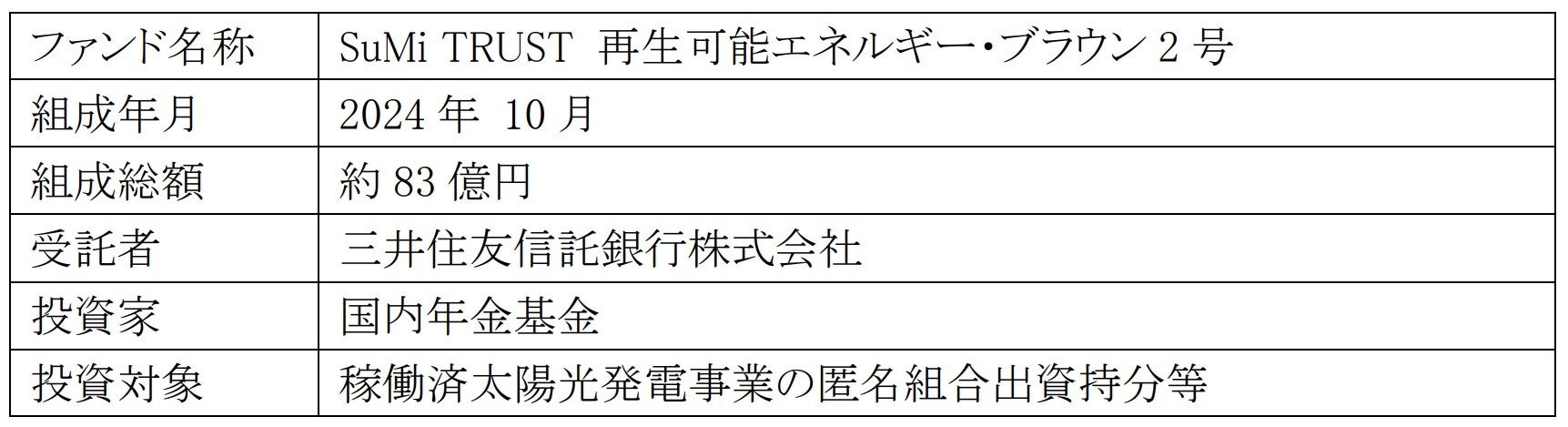 本ファンドは、三井住友信託銀行が、国内年金基金の安定した収益確保ニーズに応えるために、これまでに組成した再生可能エネルギーファンドの知見を生かし、初めて国内年金基金向けに組成しました。再生可能エネルギー(以下「再エネ」)電源を投資対象としながら、本ファンドの運用期間終了後、投資した再エネ電源を大阪ガスが取得することで運用期間を短縮し、国内年金基金の投資ニーズに応える商品設計を実現しました。