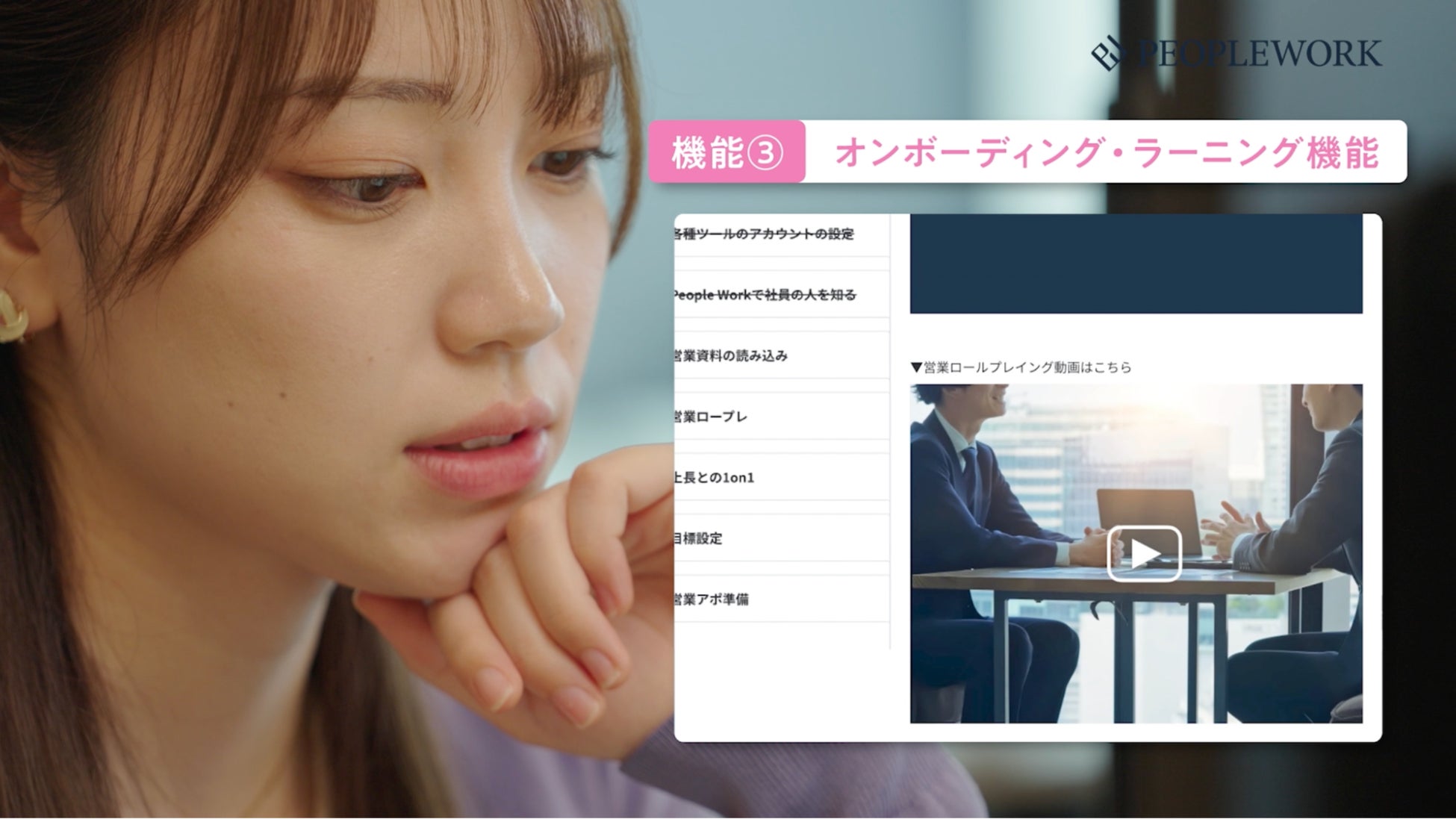 「PeopleWork」は、企業の持続的な成長のために、社員の能力発揮を支援するエンプロイーサクセスHRプラットフォームです。入社準備からオンボーディング、業務遂行、能力開発・人材開発など、エンプロイージャーニーの各段階において、能力発揮を促し、活躍人材になれる環境を提供します。社員同士のコラボレーション基盤となるPeopleWorkプラットフォームに加え、人材開発・オンボーディングのためのアプリケーションや、自社の人材育成のニーズに合わせ、必要なラーニングコースを自由に選択し導入できるラーニングストアなどの機能が備わっています。