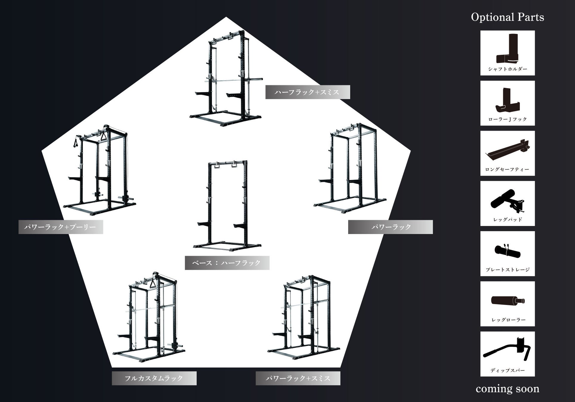 中級~上級者向けの強度と機能性を備え、自分好みの機能で構成可能。ベーシックな構成から徐々に拡張するも良し、最初からフルカスタムでジムクオリティを目指すも良し。必要な機能だけを導入し、将来の目標や変化に合わせて進化させられます。