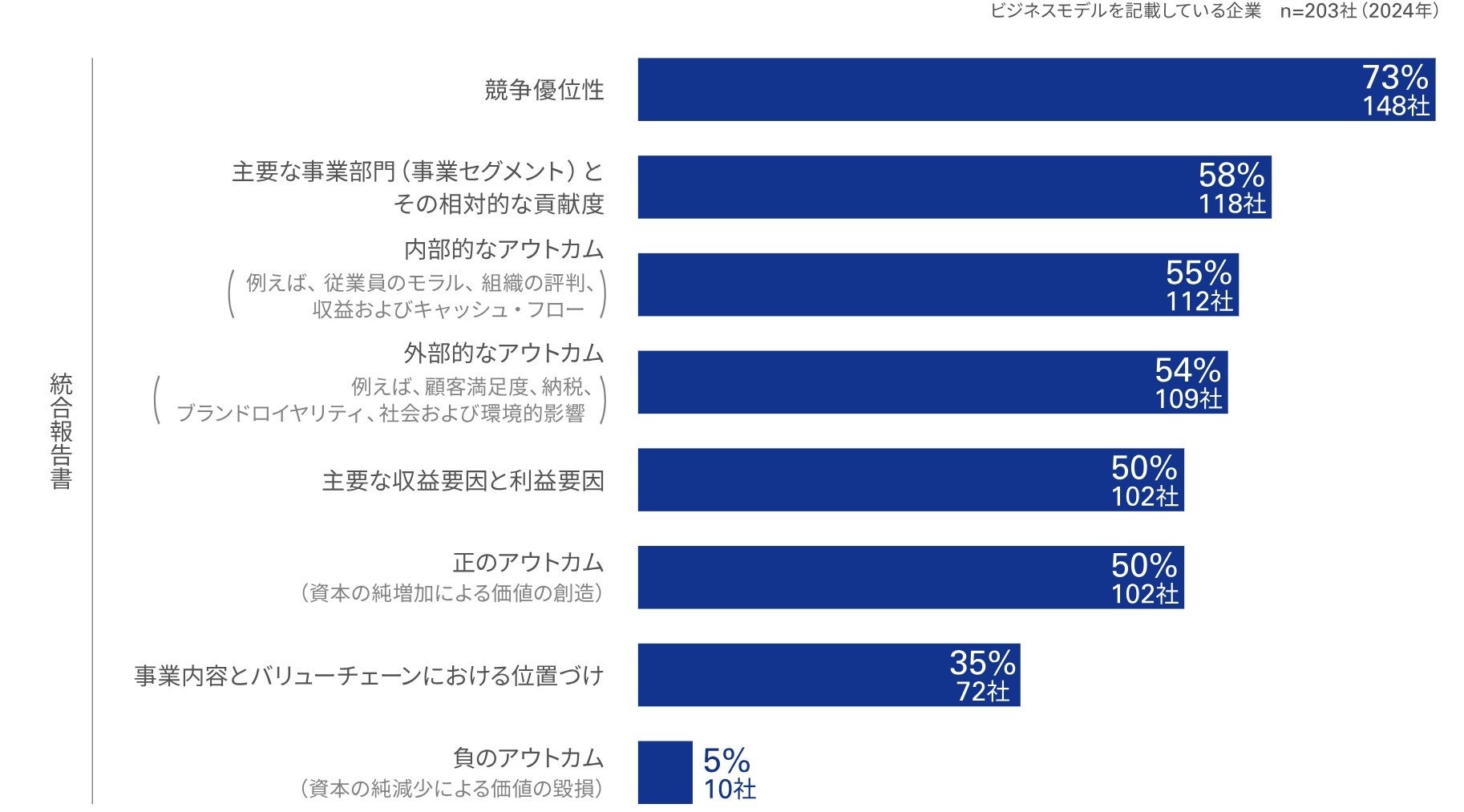統合報告書においてビジネスモデル(価値創造プロセス図等)を掲載する企業は90%となり、自社の事業活動がどのように価値を生み出しているのか、ビジネスモデルの説明を通じて報告がされています(図3)。しかしながら、その収益要因や具体的なアウトカムについて記載している企業は半数程度で、必ずしも明瞭に説明されていません(図4)。そのため、企業独自のビジネスモデルがどのように価値を生み出しているのか、十分に理解することが難しい状況が見受けられます。価値創造プロセスをより具体的に説明することが望まれ、そのことは説得力のある戦略と資源配分の説明にもつながります。