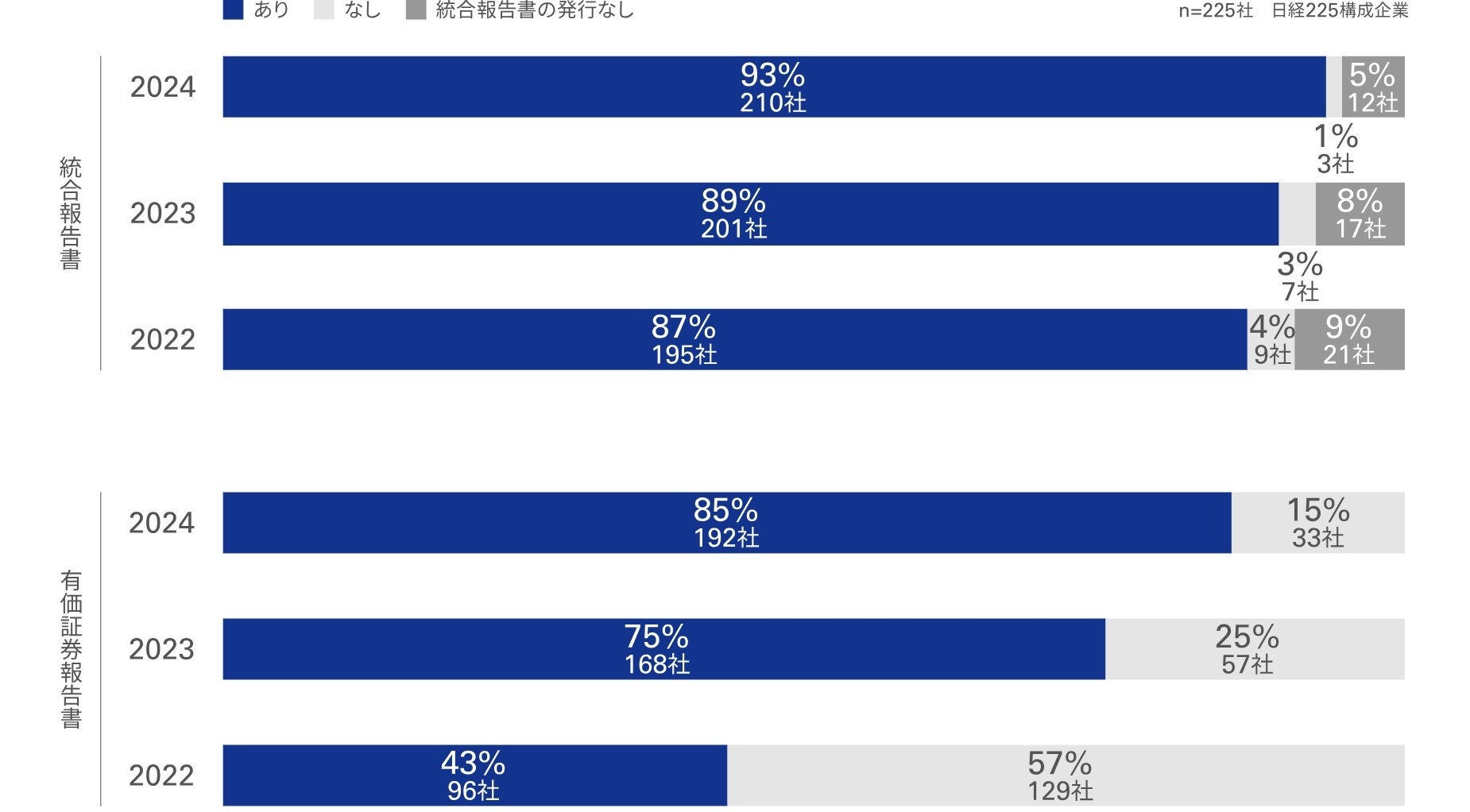 統合報告書、有価証券報告書の記述情報、サステナビリティ報告の比較調査: 日経225構成企業225社 統合報告書の発行企業等および統合報告書に関する基礎調査: 「自己表明型統合レポート」を発行する国内の企業等1,177組織 |