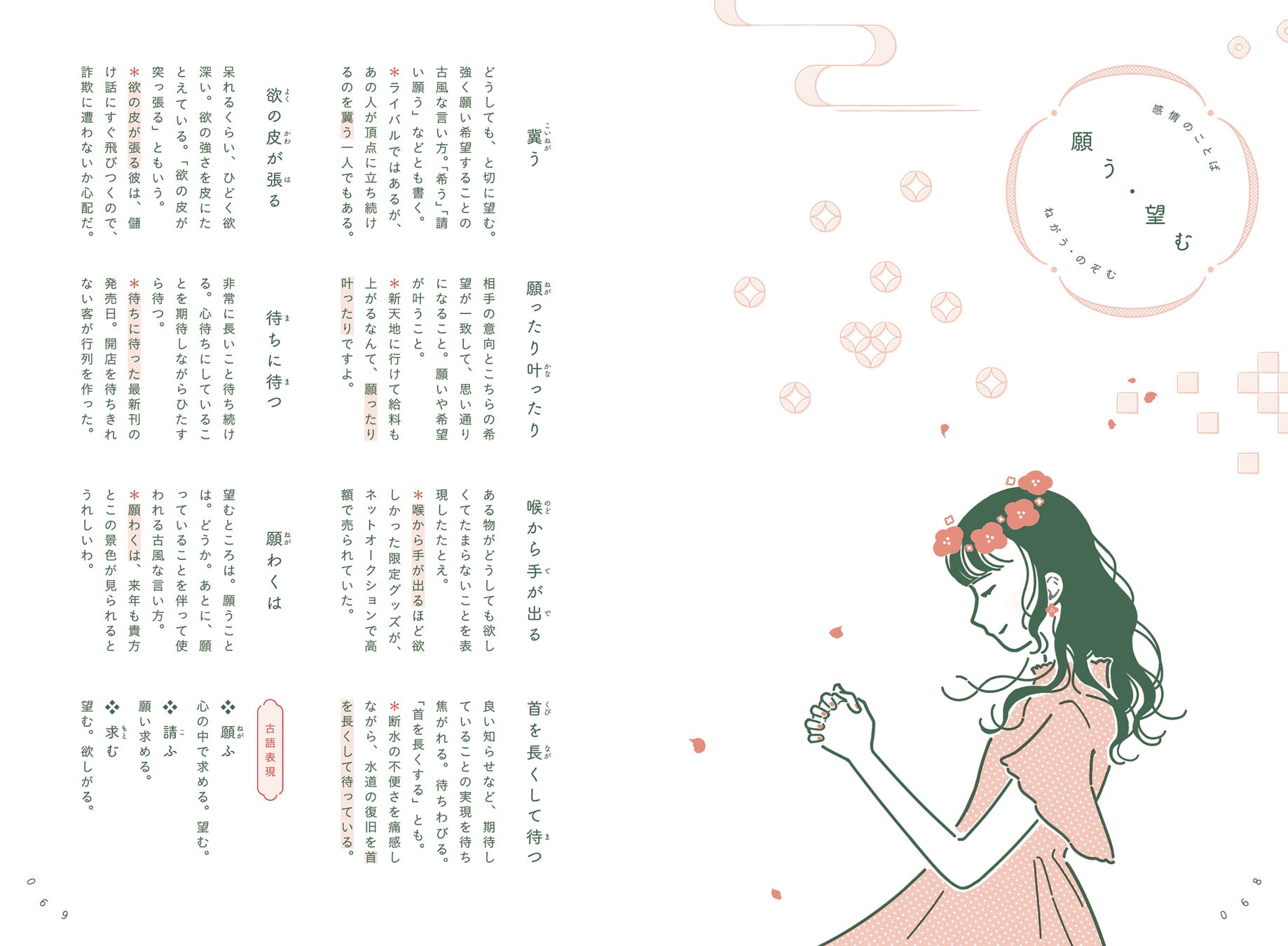 本書では、「感情のことば」「様子・状態のことば」「性格・性質のことば」「行動・動作のことば」の4カテゴリーに分けて、気持ちにまつわる和のことばを紹介しています。