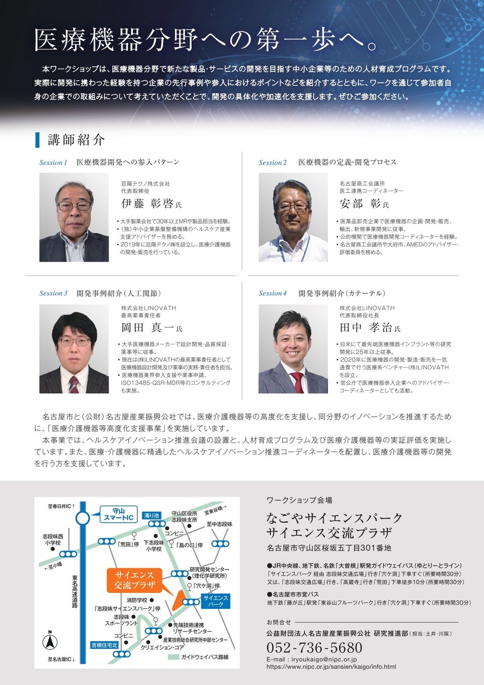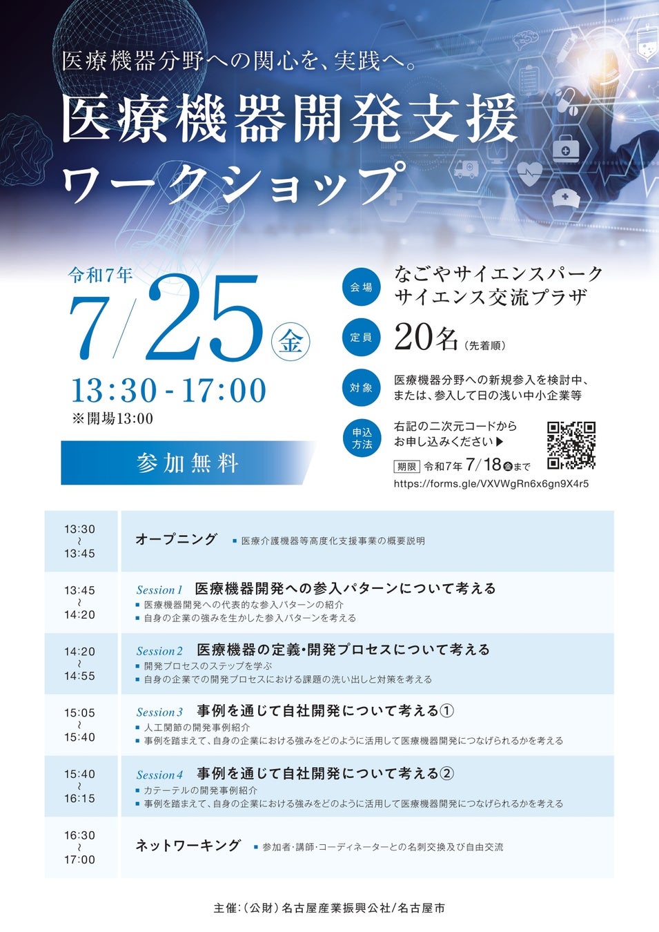 本ワークショップは、医療機器分野への新規参入や、新たな医療機器の開発を目指す中小企業等を対象とした実践的な開発プログラムです。今回は、開発に携わった方による事例紹介や、参入時におさえておきたいポイントを解説いたします。