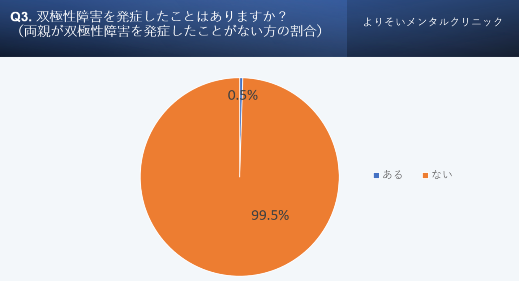 その結果、両親が双極性障害を発症したことがない方の中で、双極性障害を発症したことがある方の割合は約0.5%だと分かりました。