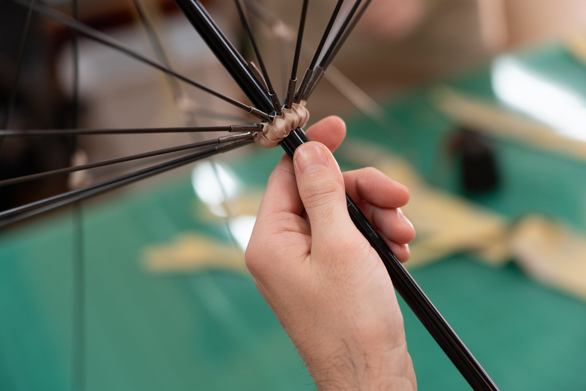 カーボン製の骨はやわらかく、生地に強いテンションを張ることが大変難しく、熟練の技が必要になります。前原光榮商店の職人たちがミリ単位の裁断・縫製・仕上げを行い、無駄なシワがなく開いた時も閉じた時も美しいシルエットの傘を作り出します。