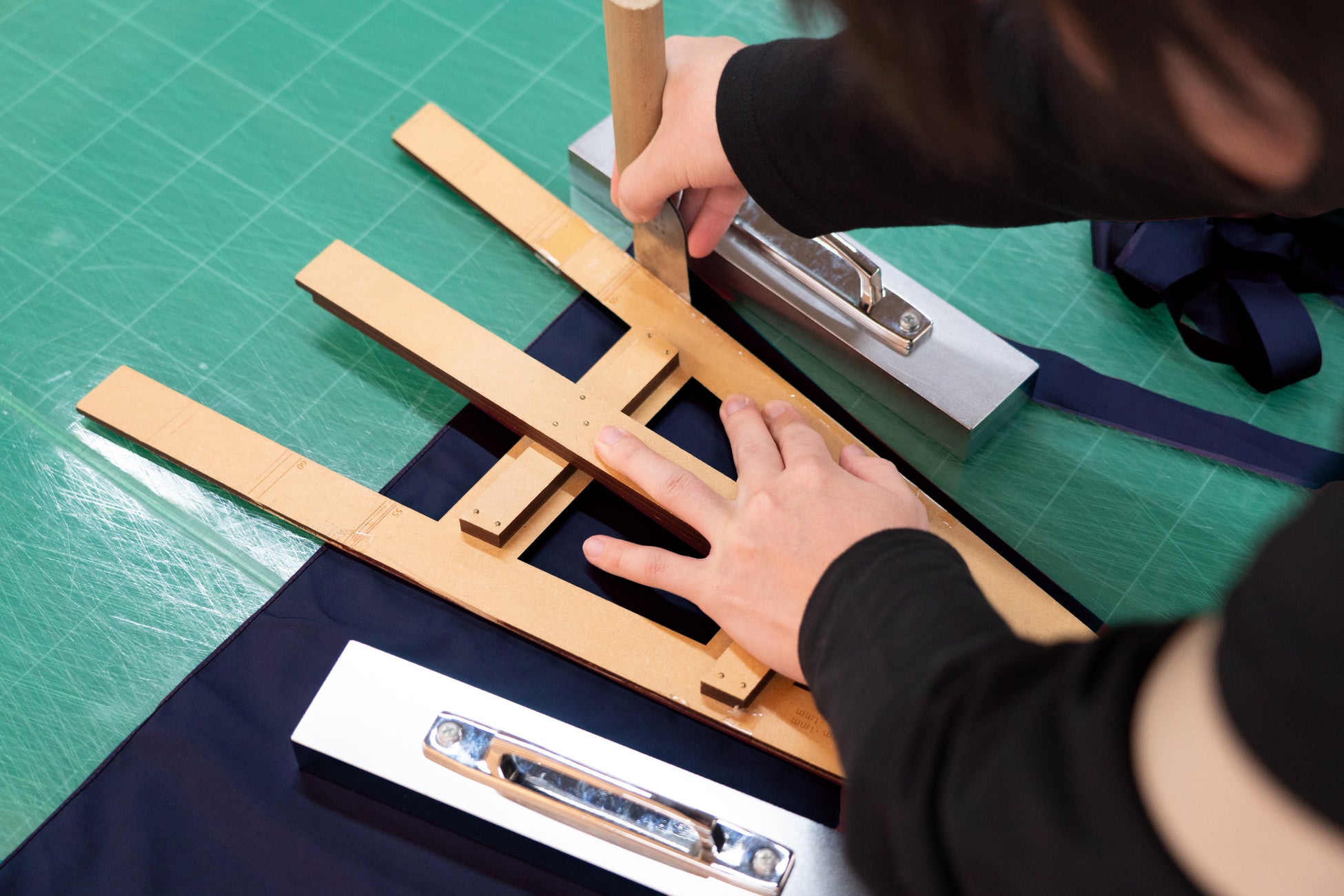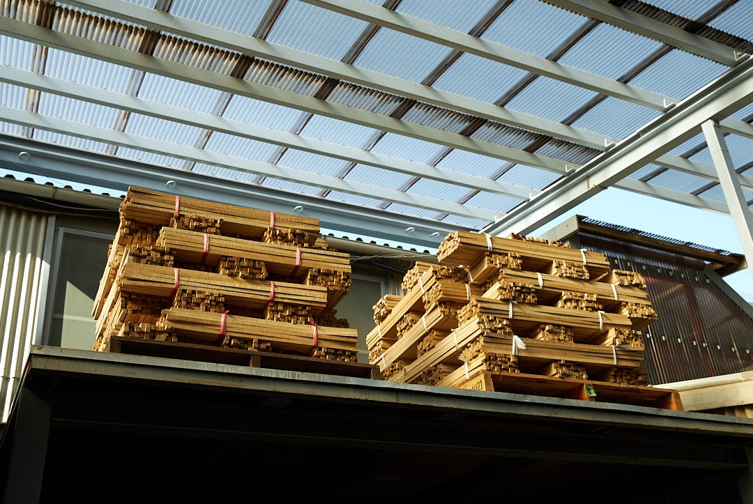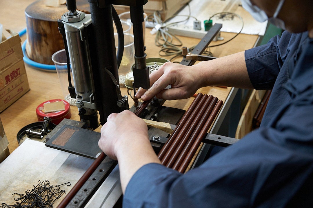 中棒には昔ながらの樫の素材を採用。国産の希少な木製の中棒は、角材の状態で数年間寝かすことにより歪みを最小限にとどめます。そこから丸く削り出した棒に、職人の手作業で細かいパーツを一本一本丁寧に埋め込んで骨組みを作り上げます。