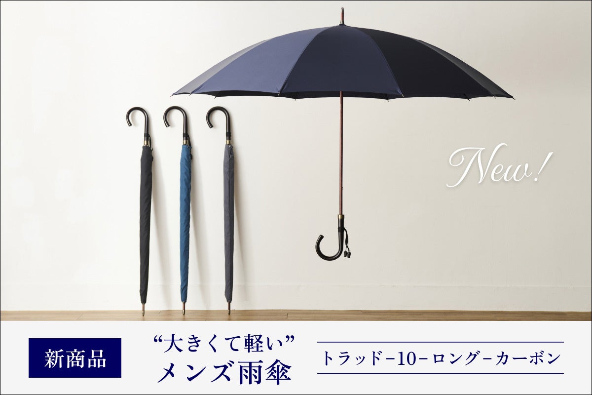 東京・台東区蔵前にある老舗洋傘メーカー・前原光榮商店では、2026年5月1日(金)より公式オンラインショップにて、メンズ雨傘の「トラッド-10-ロング-カーボン」シリーズを発売いたします。