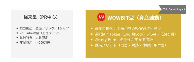 本モデルは、ブロックチェーントークン「WOWBIT(ワオビット)」を活用し、スポンサー企業が提供する支援金に対して、将来的なトークン付与権(SAFT)または現物付与型トークンのいずれかを選択できる仕組みを採用しています。これにより、従来「広告費」として消費されていた支援金を、資産性と社会的意義を両立する新しい応援の形へと転換します。