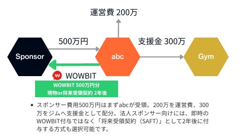 スポンサー企業は支援金を提供し、その同額相当のWOWBITを受領します。