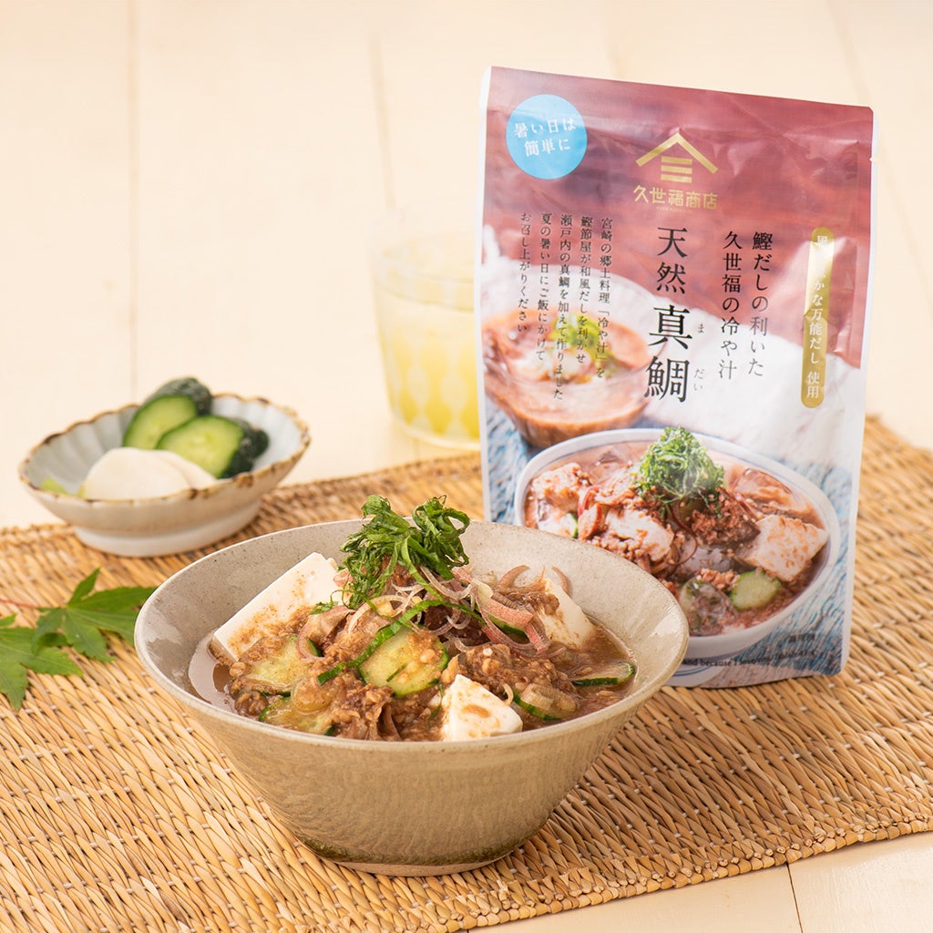 瀬戸内で獲れた真鯛の旨みがぎゅっと詰まった、久世福の冷や汁。よく冷やした本品をご飯にかけて、紫蘇やみょうがなどの薬味をトッピングするだけで、贅沢な一食の完成です。真鯛の身が口の中でほろほろとほぐれ、上品な美味しさが口いっぱいに広がります。