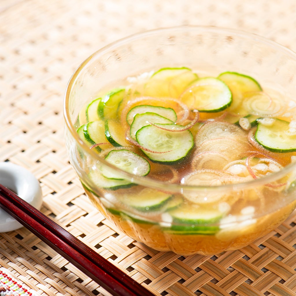 「冷やし昆布だし」は夏のお料理に大活躍。 水出し昆布だしに味噌を溶いて、旬のきゅうりとみょうがを入れるだけで火を使わずに「冷やし味噌汁」の完成。そうめんのつけだれなど、夏の定番料理にも幅広くお使いいただけますよ。