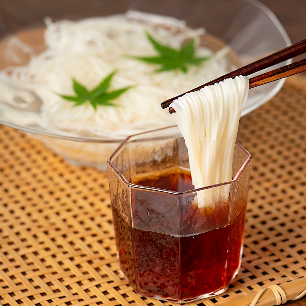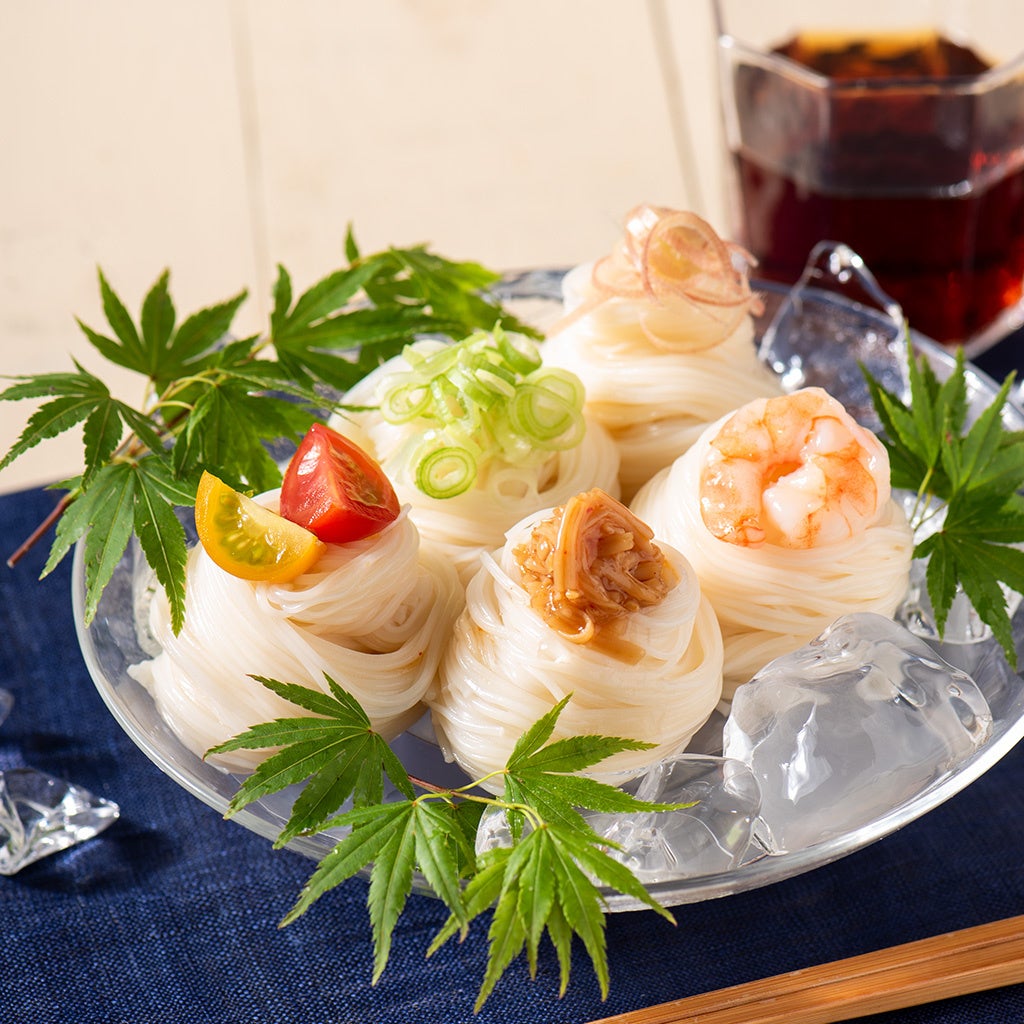 いつものそうめんに「七味なめ茸」をのせれば、シャキシャキ食感とピリ辛さがアクセントとなり、味変が楽しめますよ。サラダのドレッシング、お魚のカルパッチョ、冷しゃぶのソースにもお使えて、お料理の幅がぐんと広がります。