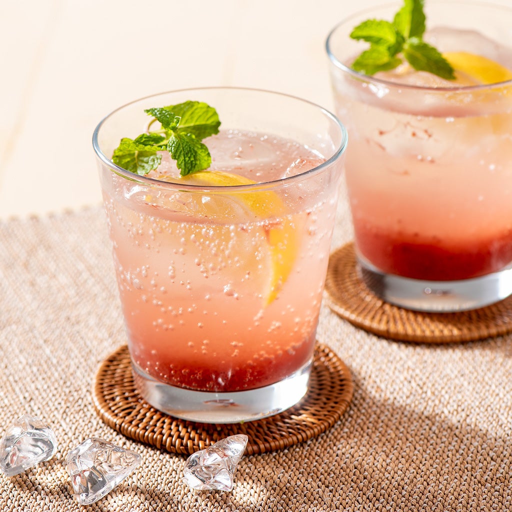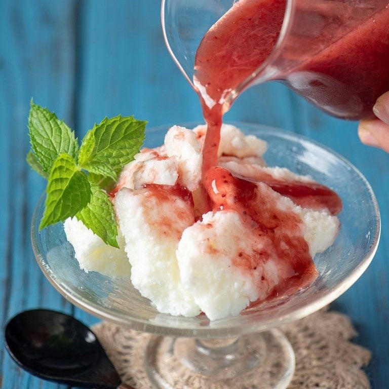 夏は炭酸で割って、シュワッと爽やかに楽しむのもおすすめ。牛乳と練乳を混ぜて凍らせたミルクアイスに、いちごミルクの素をたっぷりかければ、ひんやり甘酸っぱい「いちごミルク氷」の完成です。