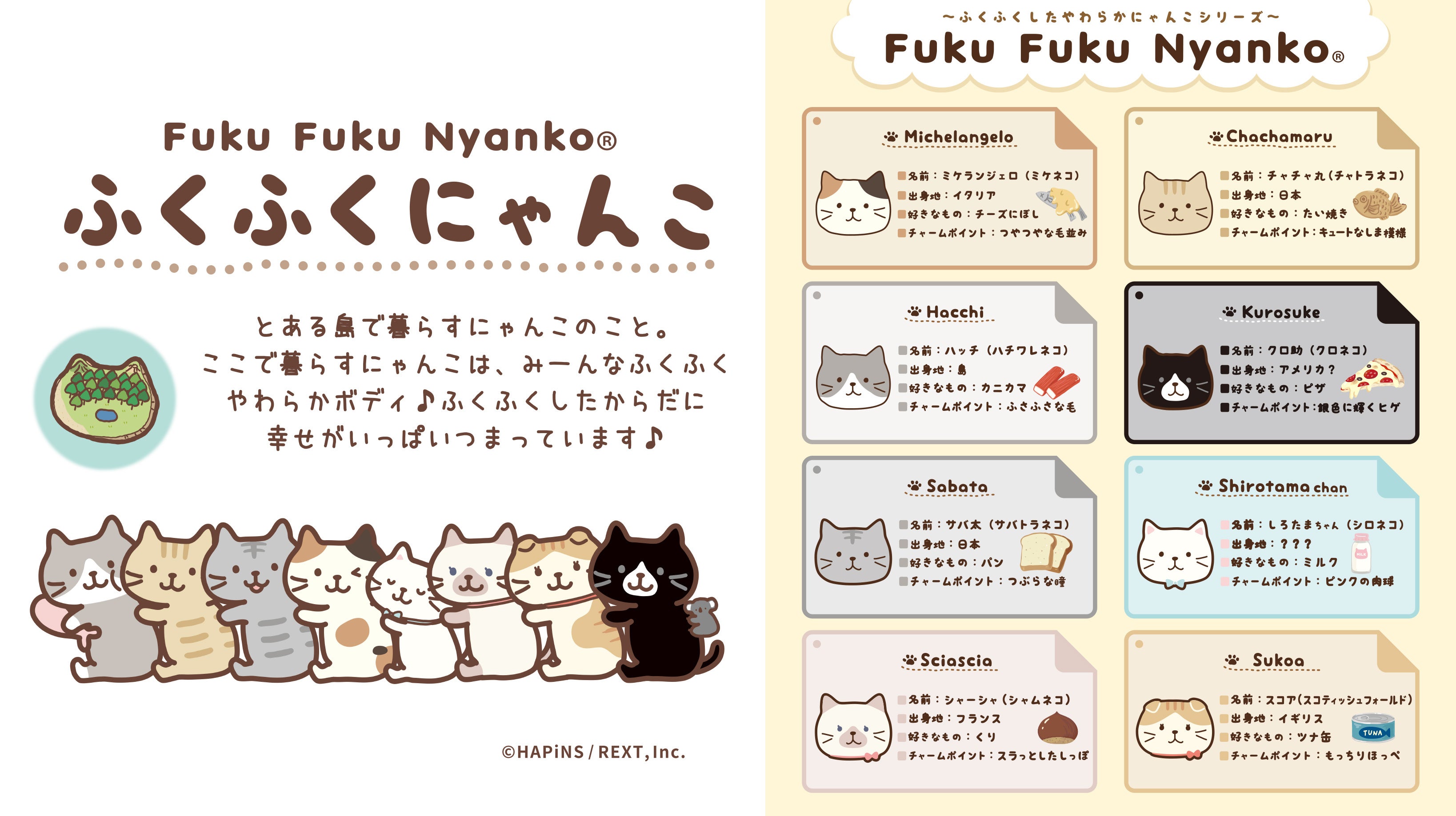 「Fuku Fuku Nyanko(ふくふくにゃんこ)」は、インテリア・生活雑貨専門店HAPiNS(ハピンズ)から誕生したオリジナルキャラクターシリーズです。