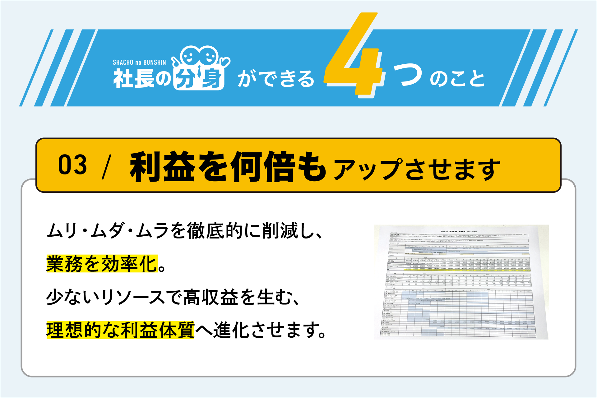 組織で共有・再現できる形にすることを目的とした経営支援サービスです。
