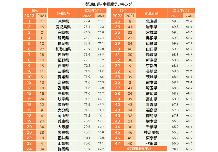 幸福度1位は沖縄県(2年連続)。愛着、定住意欲と3冠に