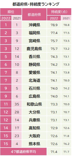 2位は鹿児島県で75.4点と昨年の15位から順位、点数ともに大きく上昇。3位は宮崎県が74.9点でランクインするなど、上位3県のいずれも九州地区が占める結果となりました。
