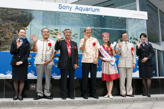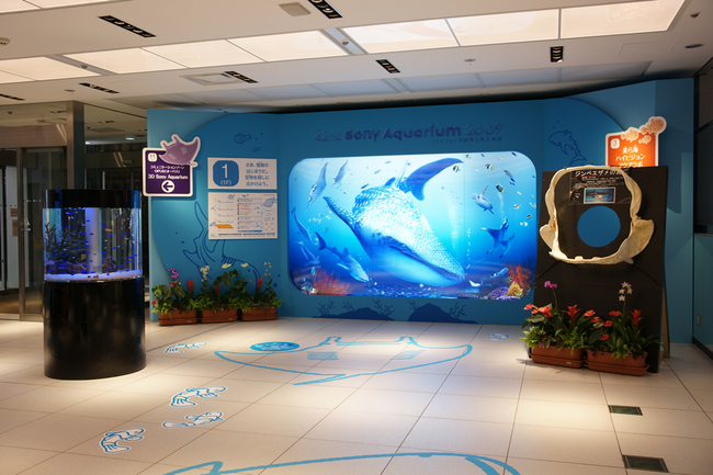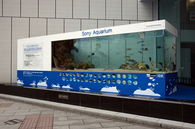 ソニービル屋外には、14トンの大型水槽を設置して本物の魚たちが泳ぎ、館内では沖縄