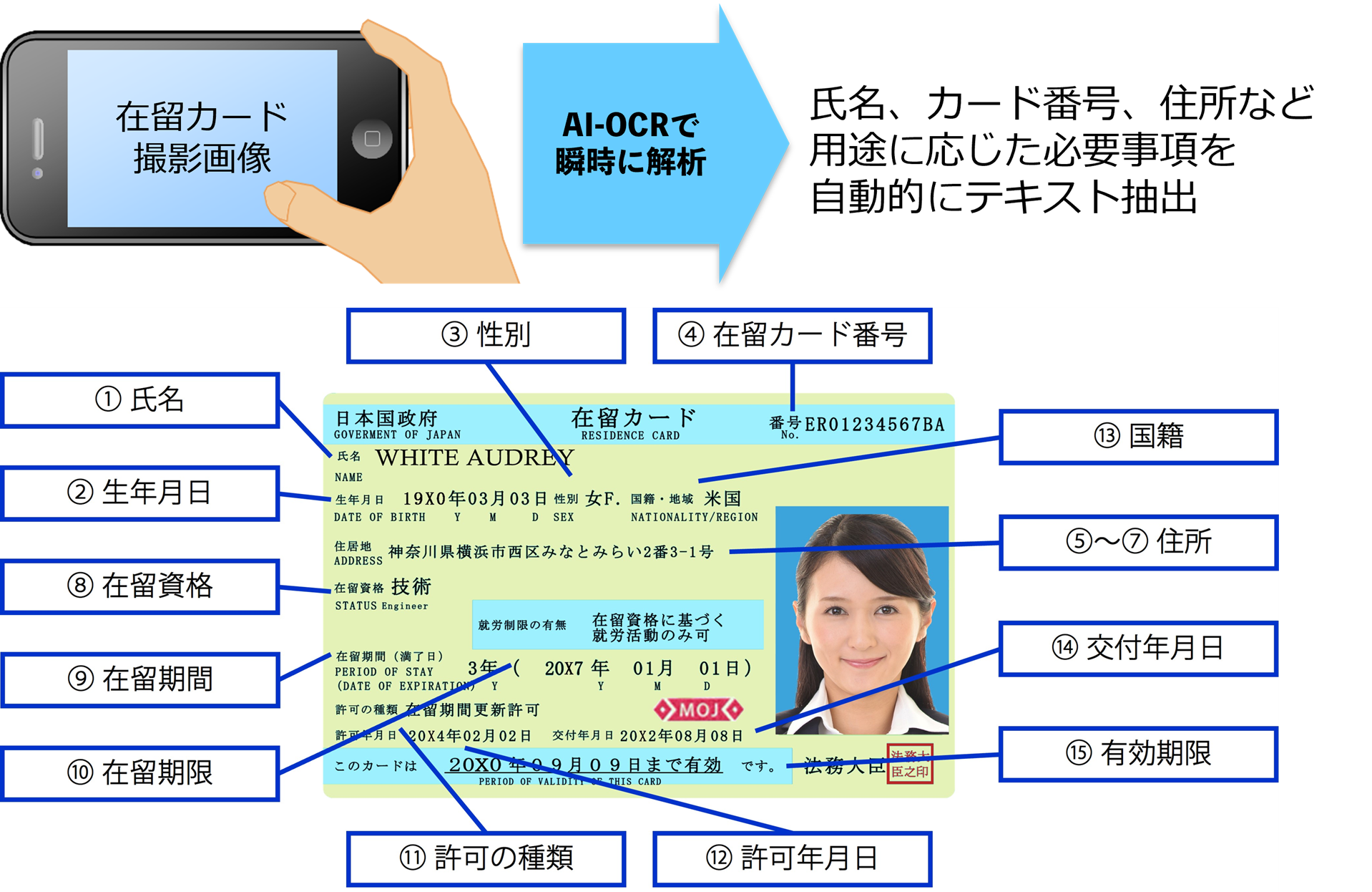 AI-OCR版では、在留カードに特有のホログラムの上からでも精度の高い読み取りが可能となりました。また、読み取り可能項目として「在留資格」「在留期限」を追加しました。
