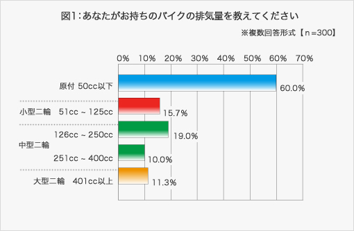 お持ちのバイクの排気量をお聞きしたところ、最も多かった回答は「50cc以下(原付)」の60.0%という結果になりました。次いで「126cc~250cc(中型二輪)」の19.0%、「51cc~125cc未満(小型二輪)」の15.7%という結果になっています。
