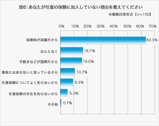 任意保険に加入していない方へ加入していない理由をお聞きしたところ、「保険料が高額だから」が63.3%で最も多い結果となりました。さらに、「なんとなく」16.7%、「手続きなどが面倒だから」16.0%という結果が続いています。