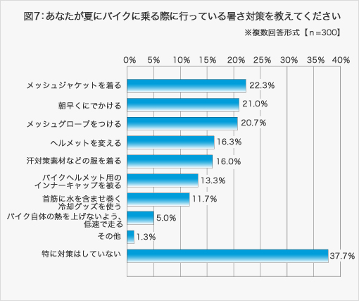 夏にバイクに乗る際に行っている暑さ対策をお聞きしたところ、1位は「メッシュジャケットを着る」の22.3%、2位「朝早くでかける」21.0%、3位「メッシュグローブをつける」20.7%となりました。