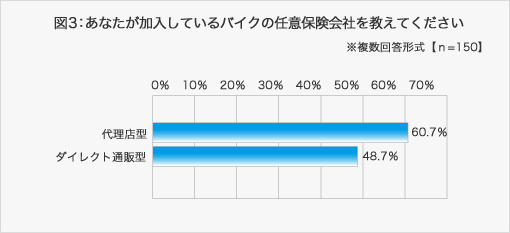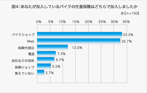 加入している任意保険はどのように加入したのかお聞きしたところ、1位「バイクショップ」33.3%、2位「Web」32.7%、3位「保険代理店」12.0%という結果になりました。