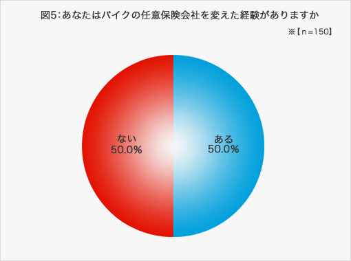 任意保険に加入している方に、任意保険加入会社を変えた経験があるかをお聞きしたところ、「ある」50%、「ない」50%と意見が割れる結果となりました。
