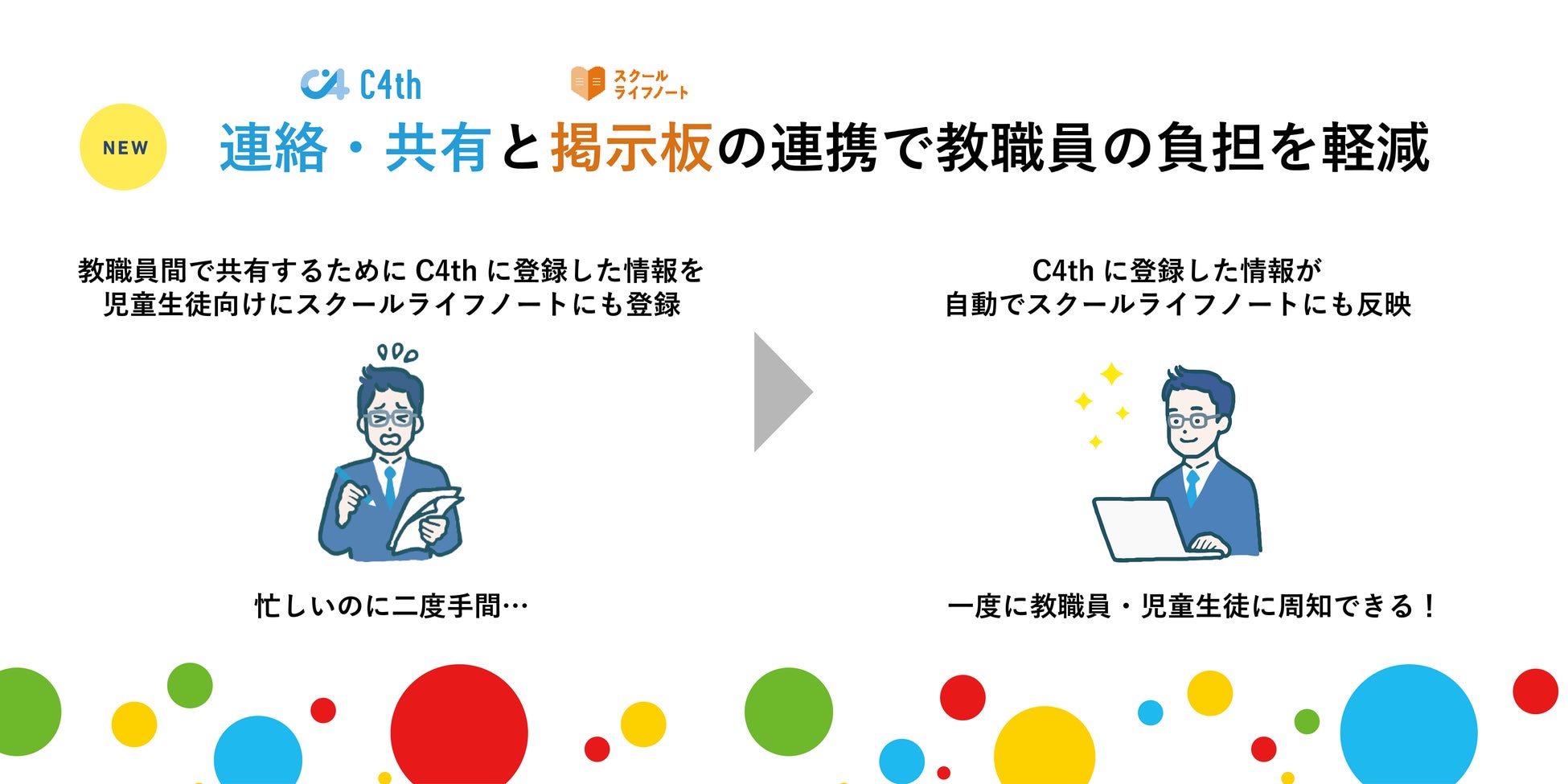 「C4th」の連絡・共有は校内および自治体内の教職員間の情報共有に使用する機能、「スクールライフノート」の掲示板は校内の教職員から児童生徒への連絡に利用する機能です。そのため、これまでは「C4th」に登録した内容を児童生徒にも共有したい場合、改めて「スクールライフノート」でも同じ内容を登録する必要がありましたが、今回の連携実現により、同内容を周知する際の手間が解消されます。