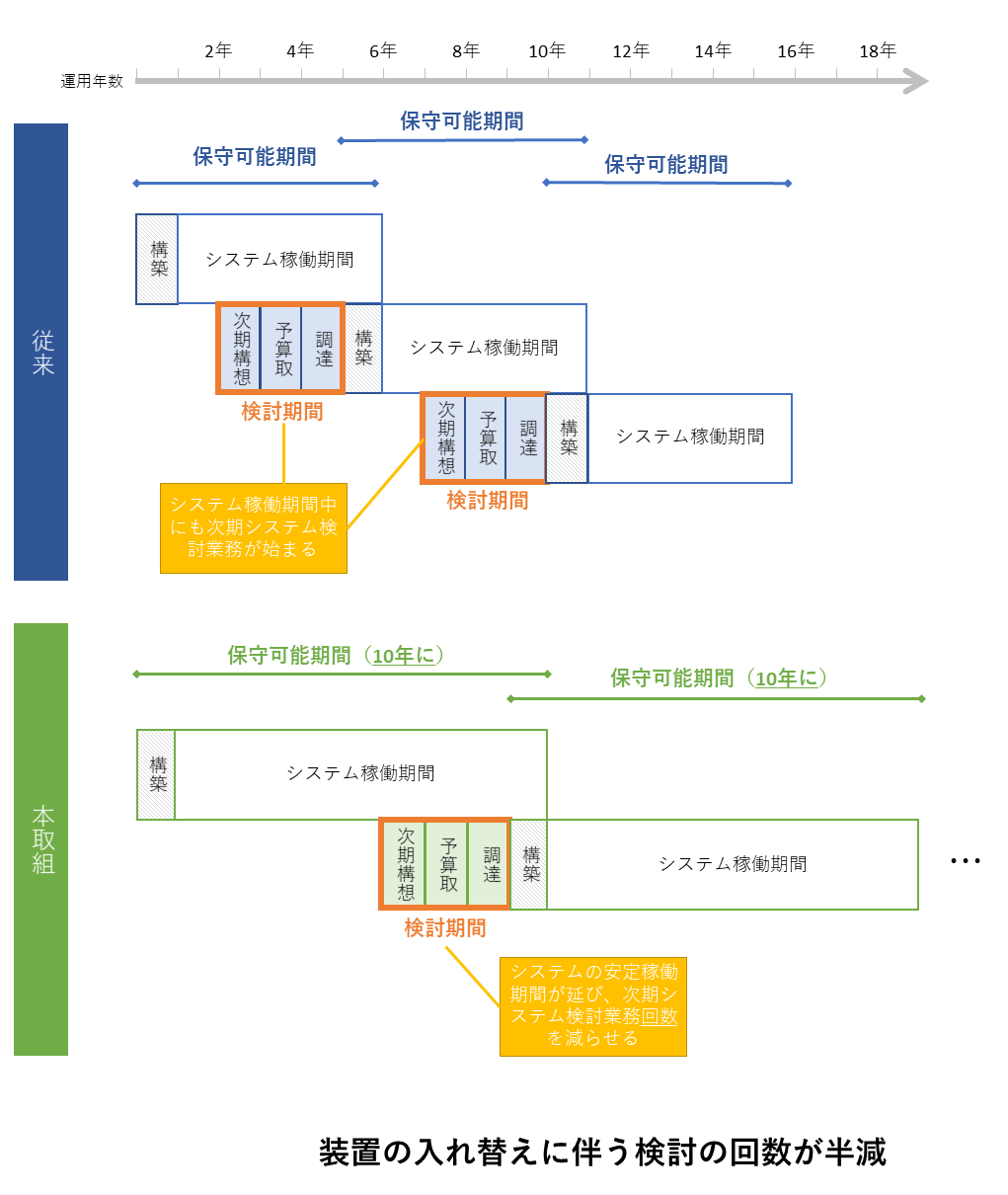 企業・公共団体で用いられているネットワーク(例:LAN・WAN基盤)の装置耐用期間は概ね5年程度であり、定期的に入れ替えを行います。準備・移行期間を踏まえると、現状の耐用期間内に入れ替えを行うためには、導入後、すぐに次の入れ替えの計画業務に入る必要があります。企業・公共団体の情報システム部門にとって、この計画業務は予算整理・設計・実装など負荷が高く、また数年がかりで行う長期プロジェクトとなります。短いスパンで計画業務が発生することは、情報システム部門がICTインフラ維持に多くの工数を割くことにつながり、その結果、企業成長に必要なICT戦略にリソースをかけきれないという課題が生まれます。